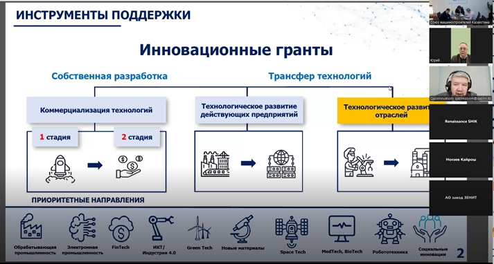 Также участникам встречи были представлены приоритетные направления поддержки, среди которых обрабатывающая и электронная промышленность, индустрия 4.0, робототехника, новые материалы, космические технологии и др.