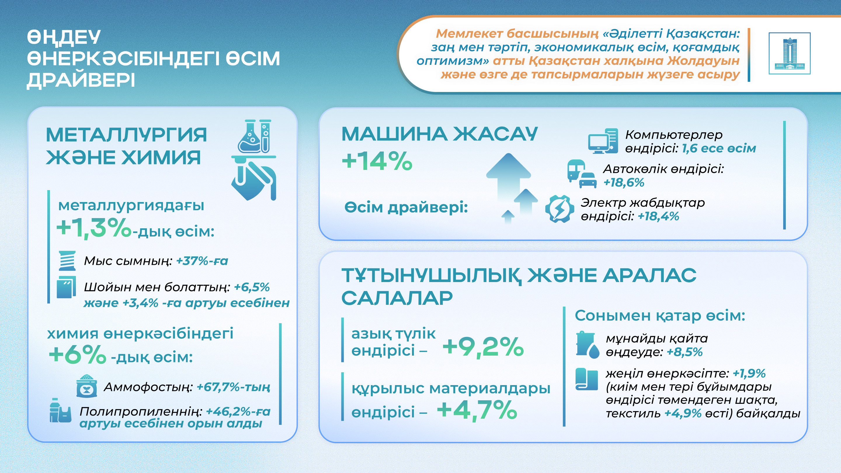Мемлекет басшысы Қасым-Жомарт Тоқаев өзінің «Әділетті Қазақстан: заң мен тәртіп, экономикалық өсім, қоғамдық оптимизм» атты Қазақстан халқына Жолдауында ел дамуының негізгі векторын айқындап берді. Ол – қуатты өнеркәсіп әлеуетіне негізделген мықты да әртараптандырылған экономика құру.