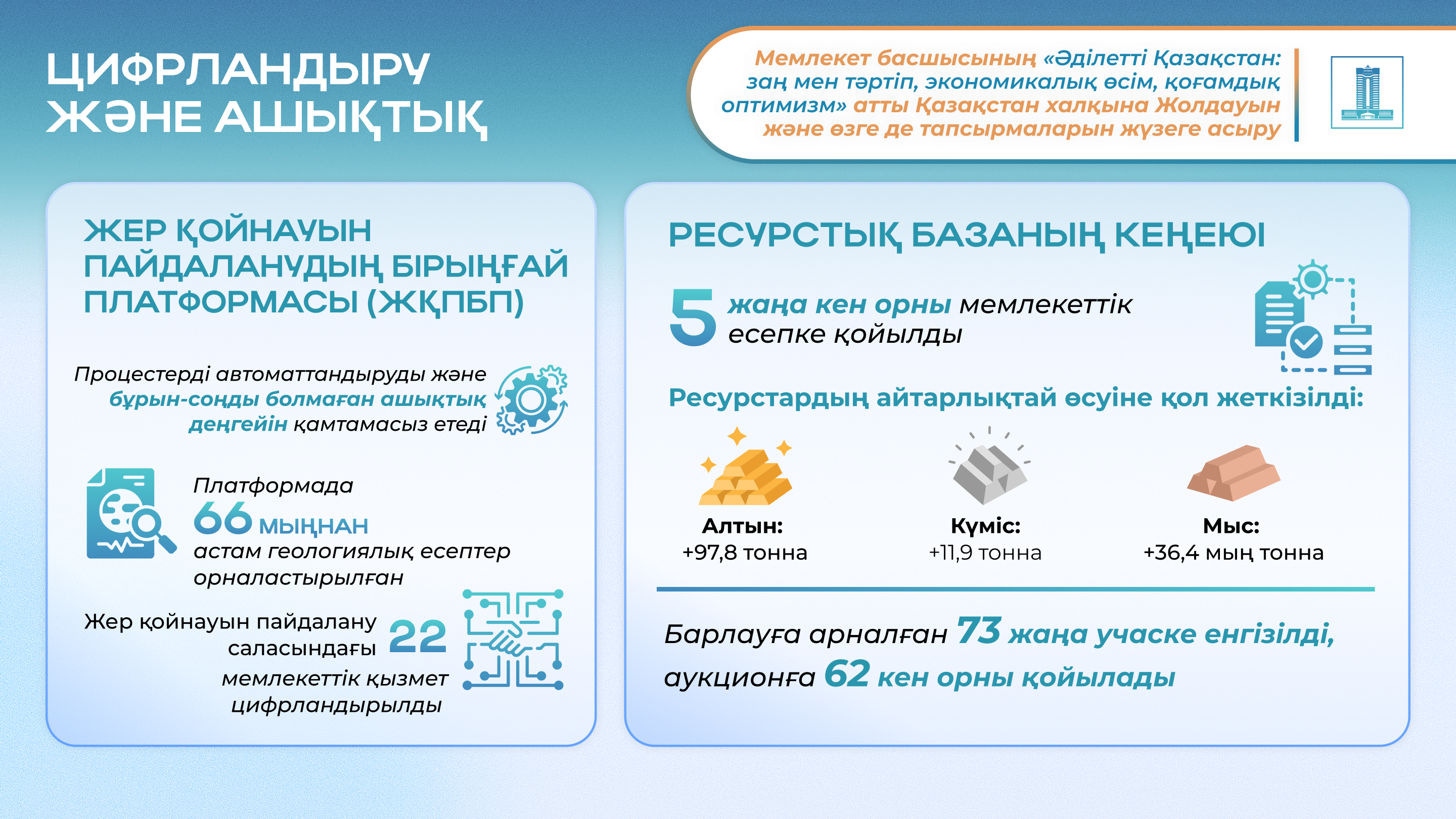 Бұл бағыттағы серпінді қадам 2025 жылы жер қойнауын пайдаланудың бірыңғай платформасын пайдалануға беру болды. Бұл ақпараттық жүйе аукциондарды қоса алғанда, барлау және өндіру құқығын алу үдерістерін автоматтандырады және бұрын-соңды болмаған ашықтық деңгейін қамтамасыз етеді. Платформада 66 мыңнан астам геологиялық есеп орналастырылған, интерактивті карта әзірленіп, 22 мемлекеттік қызмет цифрландырылған.