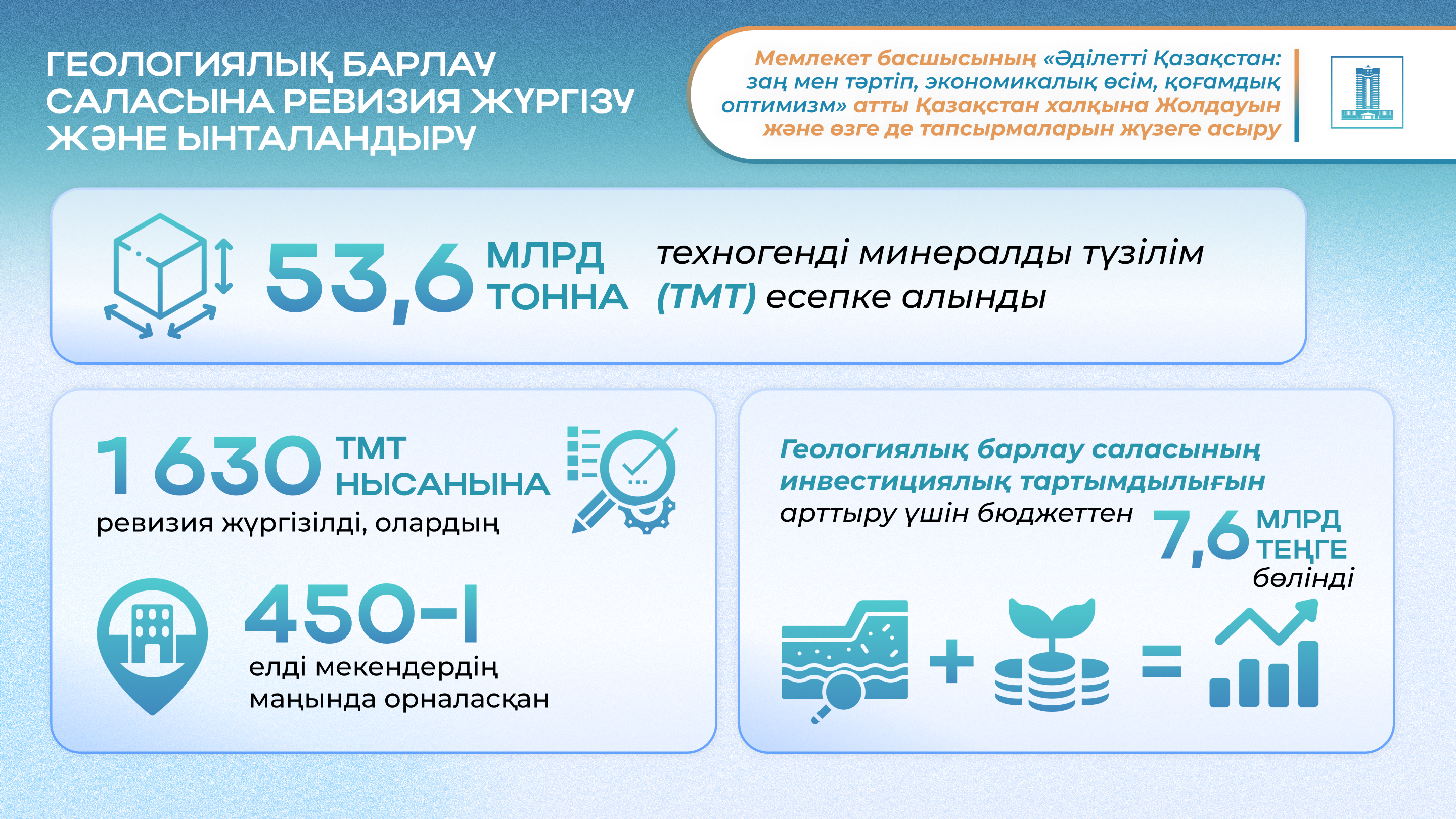 Жер қойнауын тиімді және ұтымды пайдалану – ұзақмерзімді экономикалық тұрақтылықтың кепілі. Үкімет геологиялық барлаудың ашықтығын, инвестициялық тартымдылығын және тиімділігін арттыру бойынша жұмыс жүргізуде.