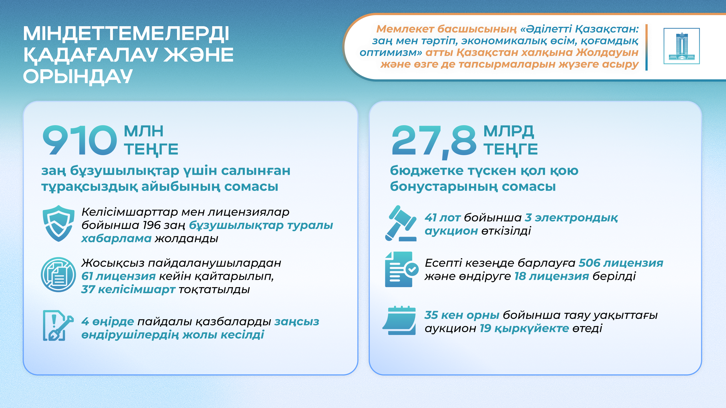 Мемлекет басшысының Жолдауында және өзге де тапсырмаларында қойылған міндеттерді жүзеге асыру барысы туралы толығырақ Primeminister.kz сайтындағы шолудан оқыңыз.