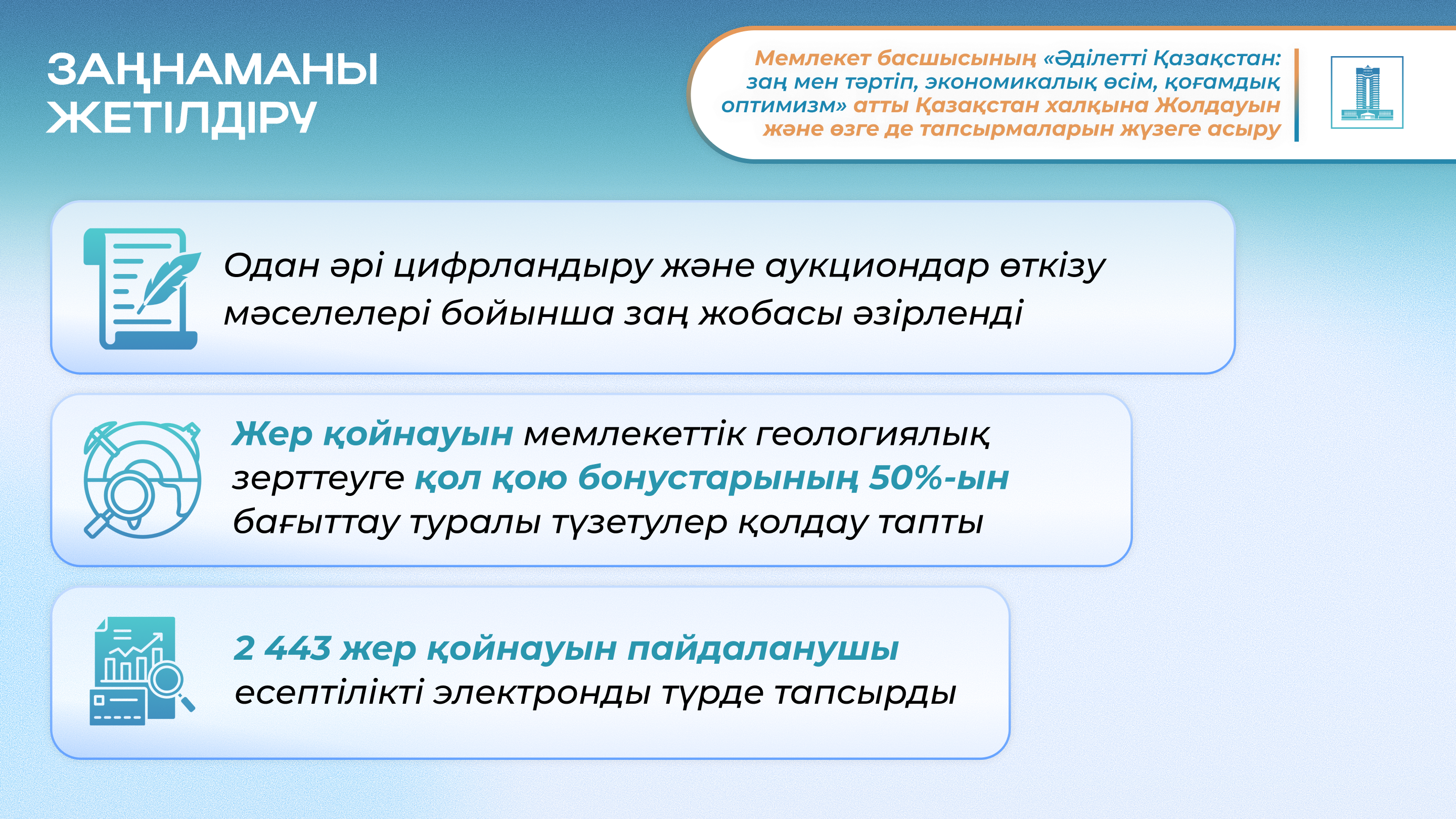 Атап айтқанда, цифрландыру және аукциондар өткізу мәселелері бойынша заң жобасы әзірленді, оны Парламентке 3 тоқсанда енгізу жоспарлануда. Негізгі министрліктер қолдаған жер қойнауын мемлекеттік геологиялық зерттеуге 50% қол қою бонустарын жіберу туралы түзетулер әзірленді.