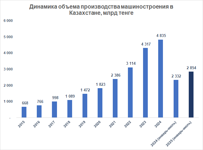 Объем производства в отрасли машиностроения демонстрирует устойчивый рост с 2015 года. Если в 2015 году показатель составлял всего 668 млрд тенге, то к 2024 году он достиг исторического максимума – 4 835 млрд тенге, увеличившись более чем в 7 раз за девятилетний период.