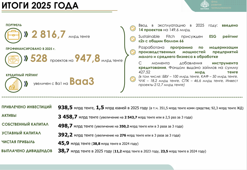 На сегодняшний день портфель ФРП составляет 2,8 трлн тенге, активы – 3,4 трлн тенге. Значительная часть профинансированных проектов направлена на обновление основных средств государственных органов и предприятий, включая закуп спецтехники для экстренных служб, общественного транспорта и железнодорожного сектора.